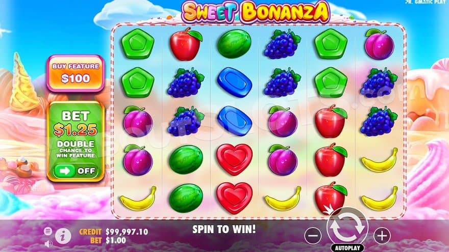 Sweet Bonanza is a video slot from Pragmatic Play on 6 reels and 5 rows. There are no regular paylines since all symbol types pay if there are enough symbols in a combination, no matter where they’re located on the reels, since it's scatter pays. Playing Sweet Bonanza can be done to the Min.bet 0.10 and the Max.bet 100, which can be raised to 125 with the Bet Multiplier. The game comes with different RTP, with the highest one at 96.49%-96.60% and the lowest one at 95.45%-95.50%. The max win is 21,175X the bet, and the game has medium/high volatility.