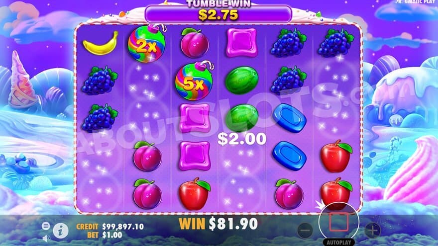 Fasten your seatbelt because this can go fast. Whenever a winning combination is made in the candy land, all involved symbols are being blown up, and new ones drop down on the reels. If a new win is created, the involved symbols will once again blow up, and new ones fall in. There’s no limit to how many times the Tumble Win can go on.