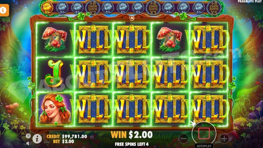 The lower paying symbols are J, Q, K and A. If you land 5 of the same symbol type, it pays 2.5X the bet. The higher paying symbols are fly agarics, wooden beer stein, a girl and the leprechaun himself. If you land 5 of the same symbol type, it pays between 3.75X to 12.5X the bet. The game's wild symbol shows the text WILD in gold, while the big golden tree is the game's scatter symbol. Throughout the game you will also be able to land money symbols which are four-leaf clovers, as well as various collect symbols which are cauldrons in different colors. Let's find out what the features do.
