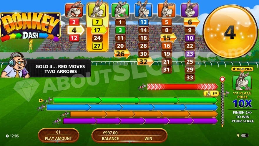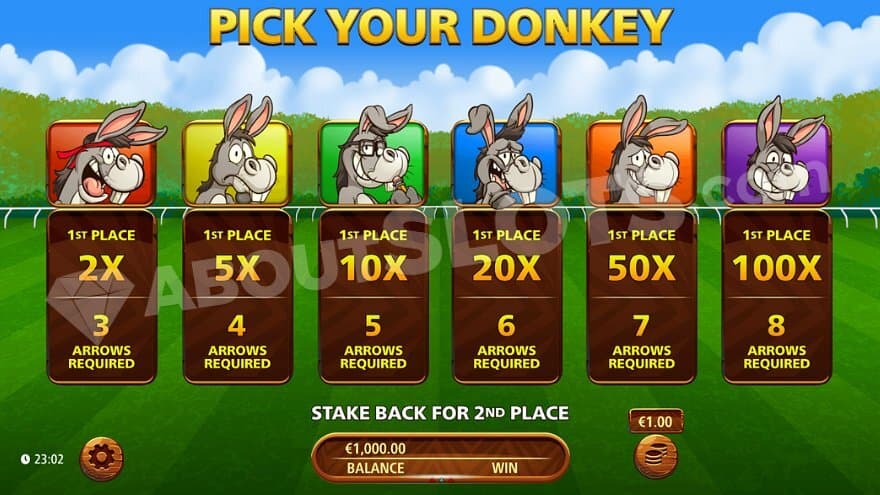 While starting the game, the player gets to choose one of the six donkeys on a pick screen. You can also change your bet, between 0.50 and 30. Every donkey has between 3 and 8 arrows going horizontally between them and the finish line. The lowest-paying donkey is the red one, doubling the bet in case of a win. He has only 3 arrows between him and the finish line. The best-paying runner in this competition is the purple donkey who has 8 arrows between him and the finish line. If you manage to race him first to the finish line, you’re awarded 100X the bet. Ending up in second place will give you 1X the bet, no matter what donkey you’re racing, and positions 3-6 don’t pay anything. This is how much each donkey pays for winning the race and how many arrows they have: