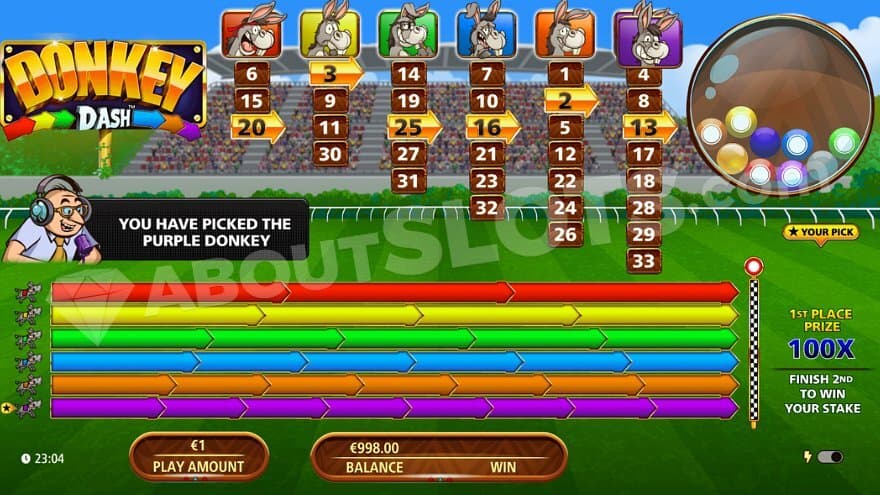 The donkeys have their looks and personalities on the pick screen, although they still look similar. While on the race stadium, the donkeys are so small, looking exactly the same if it wasn’t for having different colors. The gold number balls are a nice feature, helping the donkey a little extra by letting it step two arrows ahead. The multiplier balls are also a nice feature, possibly making your win 5 times as big. Our experience is that the multiplier ball is drawn seldomly though. The instant prize balls also give some extra spice, but they’re, in our experience, also very rare.
