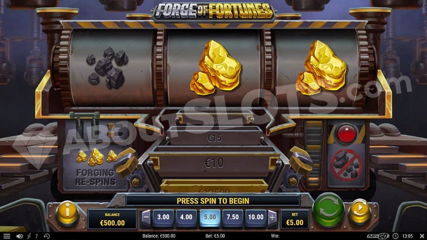 There are no lower or higher paying symbols in this game. In fact, there are only 3 symbols. Landing 3 gold nuggets will pay 2X the bet and activate the Forge respins. Landing gold nuggets on the first two reels and some slag on the third will pay back the money and take you back to a new base game spin. There’s also a coal symbol that will put you back one position on the respins ladder.