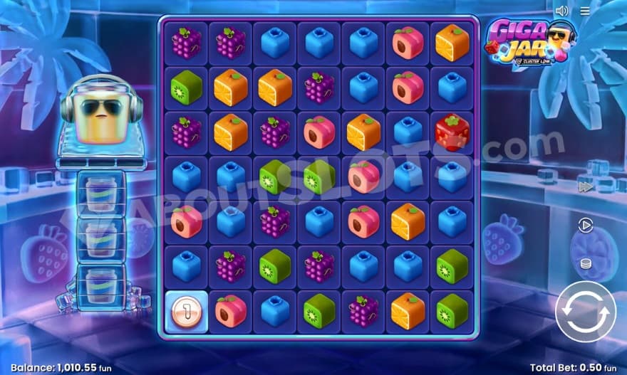 The design of the game consists of a disco theme, where we get to follow the DJ Giga Jar to the dancefloor, where the jars wildly dance around. In the background of the reels, you can see an ice bar, where the Giga Jar itself can be seen to the left of the reels. During the spins very catchy music is played, which gives the game a great uplifting touch. You can play this slot on all the devices notepads, desktops, and mobiles. A win is created by landing 5 or more of the same symbol type in the cluster, where this then triggers the cascade feature, which allows multiple wins to be created during the same spin.
