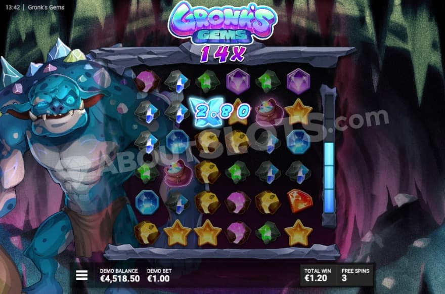 The game's design consists of a troll theme, where we get to meet the gem loving troll Gronk. In the background of the reels, we can see Gronk adorned with a lot of valuable gemstones. You can play this slot on all the devices notepads, desktops and mobiles. You create a winning combination by landing 5 or more of the same symbol type on adjacent positions in a cluster, which then activates the cascade feature.