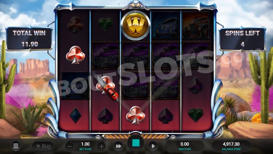 The lower-paying symbols are the suits from a playing card deck. They all pay the same, and landing a win containing 5 spades, clubs, spades, hearts, or diamonds awards 2.5X the bet. The higher-paying symbols are four pimped-out hot rods. There’s a little blue one that must be a Volkswagen Beetle, and then comes a green one with fire flames, a red one with pipes coming out from the hood, and a purple with a death skull on the front. Landing a win containing 5 cars awards between 5X and 10X the bet. The Wheelspin Wild and the Nitro Wild Symbols substitute all mentioned symbols, but not the Scatter.