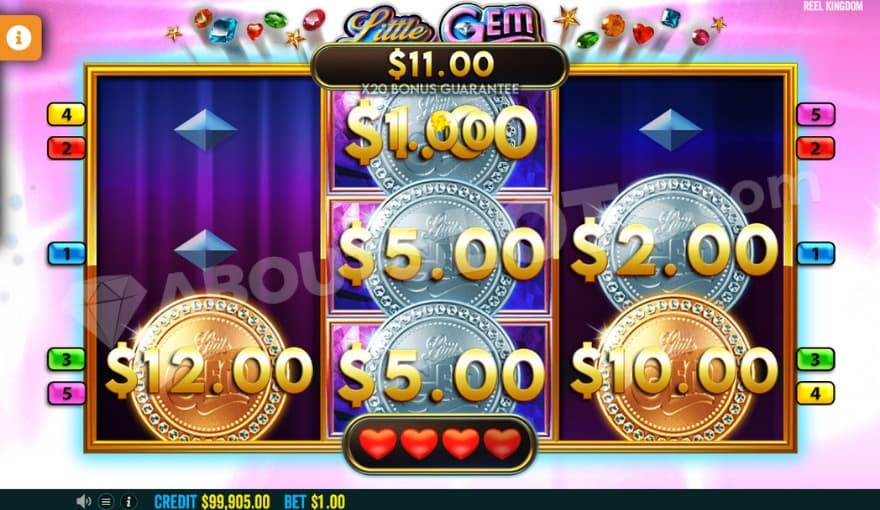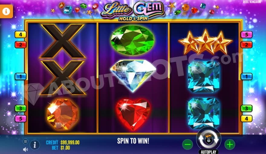 Little Gem is a video slot from Reel Kingdom that features 3 reels, 3 rows and 5 paylines. One can choose between making a Min.bet of 0.05 and a Max.bet of 250. The game has been created with two different RTPs, where it is an RTP of 96.70% by default, but game operators can also choose to use an RTP of 95.65%. Little Gem has a medium/high volatility, where you can win up to 2460X the bet.