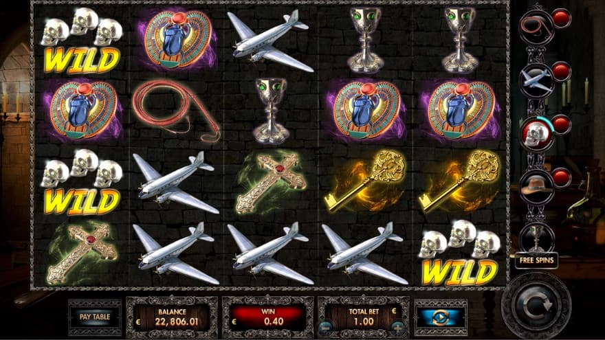 To the right of the reels, you can see 5 different Meters showing Whip, Plane, Skull, Hat and Chalice. When you then create a winning combination, the corresponding Meter will be filled with the respective symbols. Wild symbols don’t fill these Meters and once you have managed to fill up a Meter, you will get to take part in the corresponding feature. The Whip, Plane and Chalice have 11 spaces, while the skull and the hat have 10 spaces. It is also possible to fill these meters several times and then you can see on the red indicator how many times you have filled it.
