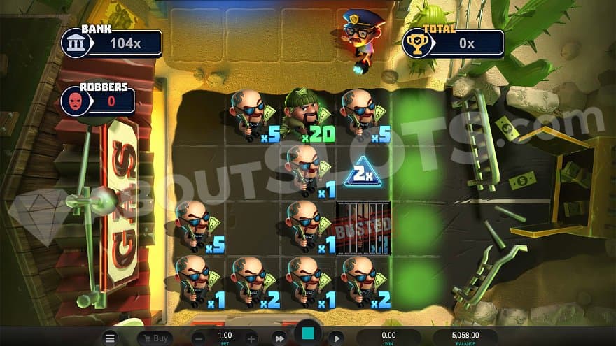 If a robber picks up a multiplier Power-Up, it further deducts the bank counter. The bank counter can’t have a negative balance, so multipliers will lose their values if the counter reaches 0. You finish the level when the bank counter reaches 0, and no more robbers will be added to the reels even if the robbers’ pool isn’t empty. The next level starts when all robbers on the screen make it to the fifth reel or are caught by the police.