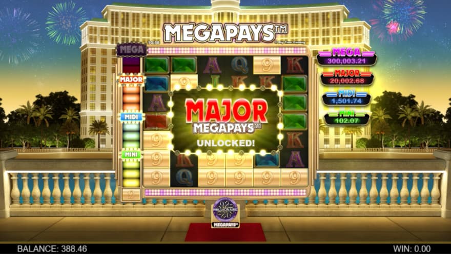 Major Jackpot (12 to 14 Megapays symbols) = Starts with €20,000 and 1.20% of your bet size is added to this Jackpot on each bet made.