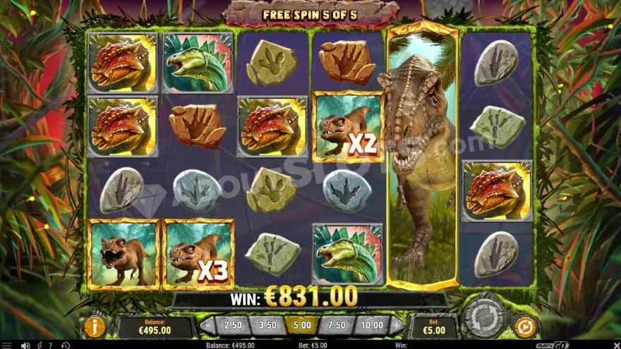 The wild rex symbol cannot land during this bonus game, but the hatchlings are sticky and can wander in either direction during the spins. They can also land with multipliers, which will be multiplied by each other if you land several within the same win. They can land with multipliers of either 1X, 2X or 3X.