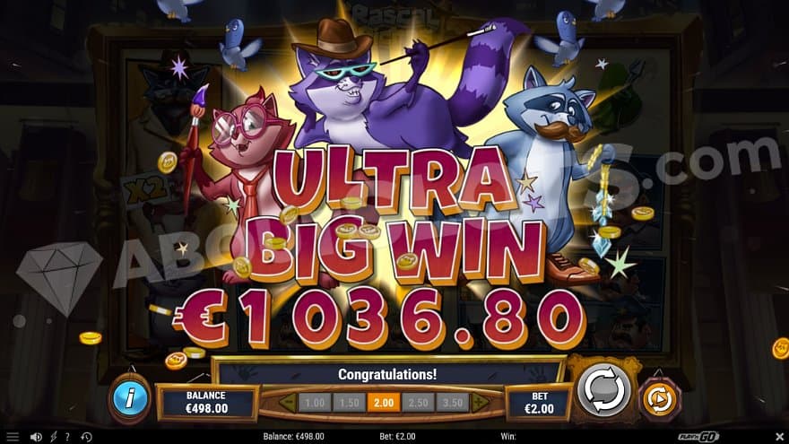 Rascal Riches is a good-looking slot where three cute cartoon raccoons create problems in a museum. Whenever they show up on the reels, they’re always together as the stacked Wild Symbol, wearing a trenchcoat like a classic movie detective. These guys can open the trenchcoat on any spin and reveal three useful features.