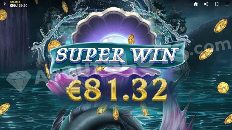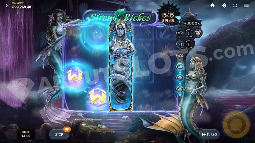 There’s also a Super Wild Symbol in the shape of the Siren Queen. It’s a stacked symbol that covers all 4 positions on the third reel and can only appear in the Sirens’ Treasure feature. It can have a multiplier of up to 3X.