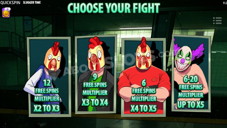 Fight 4 = You get a random number of free spins and the size of the multipliers. You can get either 6, 8, 10, 12, 14, 16, 18 or 20 free spins, regarding the multipliers you get one of these four options 2X & 3X, 3X & 4X, 4X & 5X or 5X.