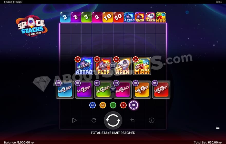Space Stacks is a video slot from Push Gaming that has 10 reels, 10 rows and 100 paylines. You can choose between making a Min.bet of 0.10 and a Max.bet of 100. The game has been created with 5 different RTPs, with an RTP of 96.23% by default, but game operators can also choose from any of the lower ones of either 95.25%, 94.29%, 90.22% or 88.47%. Space Stacks has a medium volatility, where you can win up to 5000X the bet.