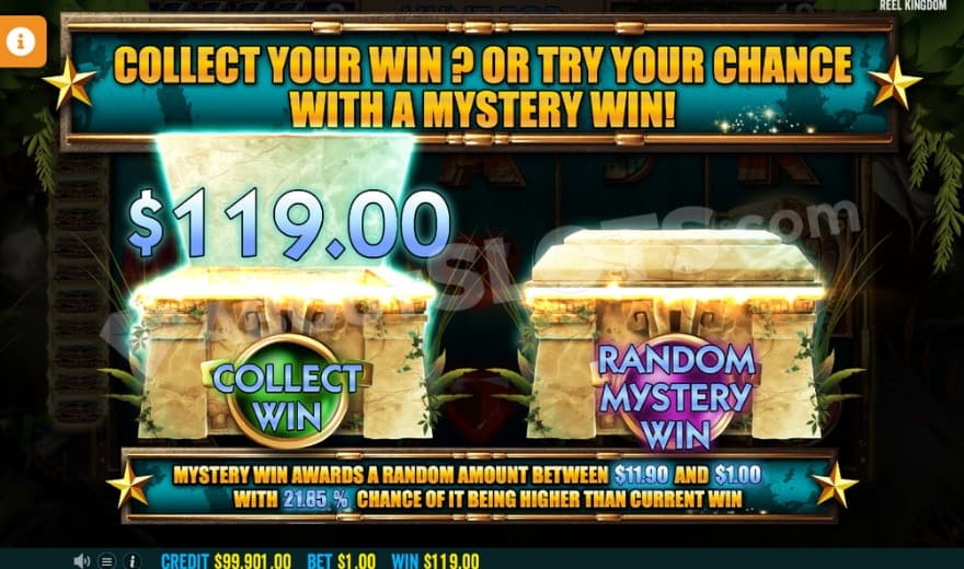 If your winnings are less than 2250X the bet at the end of the free spins feature, you can use the Mystery Prize feature. You can choose to collect your winnings or gamble to get a higher prize, where it also can be significantly lower if you are unlucky.