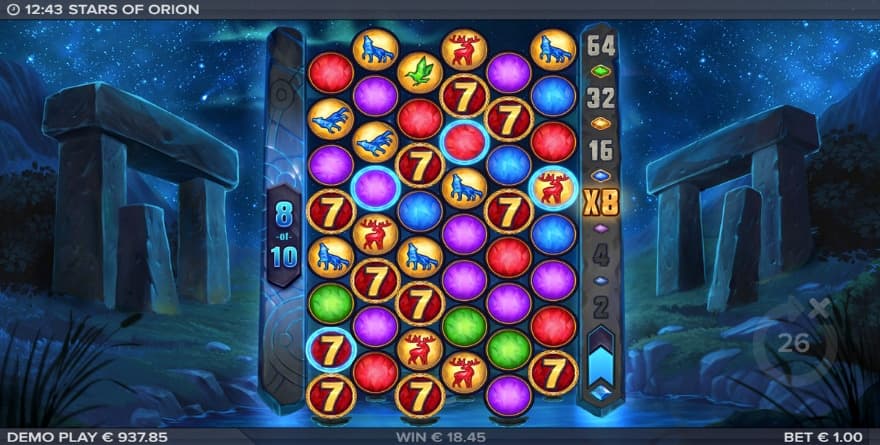 The design of the game consists of a star theme, where we can observe the brightly shining Orion in a very starry place. You can play this slot on all the device’s desktops, mobiles and notepads. You create a winning combination by landing 5 or more of the same symbol types in a cluster.