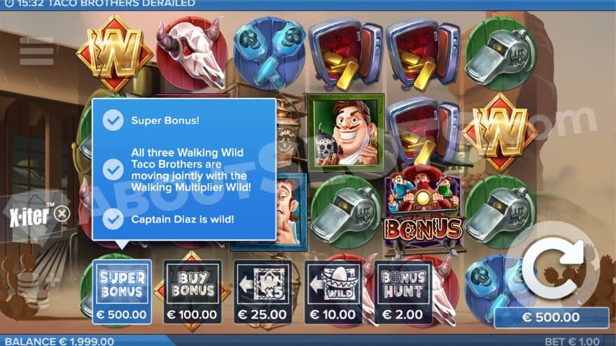 Within this fast-paced gaming adventure among taco loving brothers and gold loving Senor Diaz, we have a couple of features to help us in our pursuit of the huge wins. The features are Wild Symbol, Walking Wilds, Walking Multiplier Wild, Bonus Game, Super Bonus Game and X-iter.