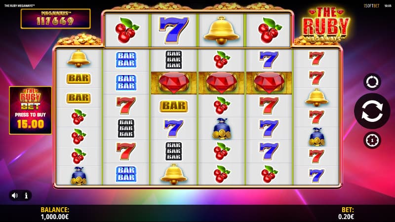 With The Ruby Megaways, iSoftBet here comes with a slot that gives us an opportunity to swim among rubies. You play on a slot that has 6 reels and 2 to 7 rows. As a result, you can get up to 117649 paylines. You can choose between making a Min.bet of 0.20 and a Max.bet of 20. The Ruby Megaways has an RTP of 96.11% in the base game and in the Ruby Bet feature it has an RTP of 96.86%. It is a high volatility, but this means that once you manage to get a win it can be big, and the game's potential maximum win is 37500X the bet.
