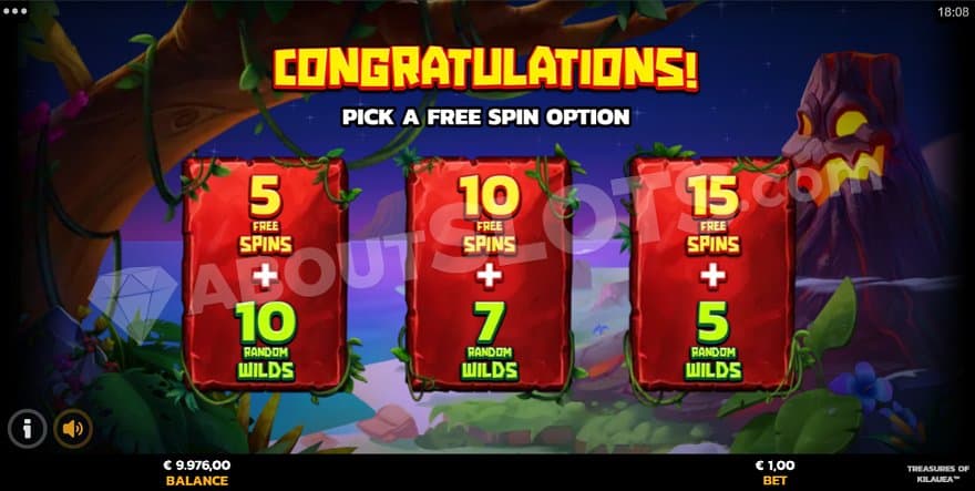 The Free Spins are triggered by landing 3, 4, or 5 scatters. When you start the spins, you can choose if you want fewer spins with more wilds or more spins with fewer wilds. These are your options: