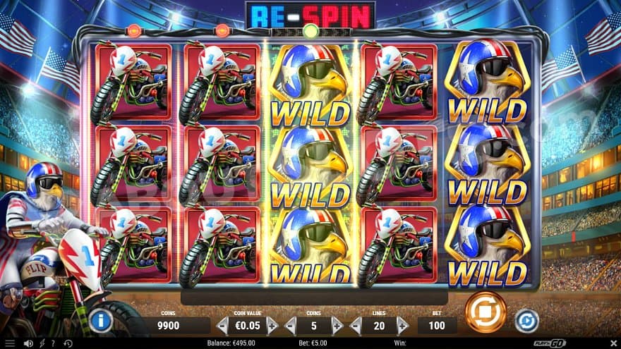 Several spectacular things are happening in the motor stadium. Whenever the eagle comes flying on his bike, watch out for the features Wild Symbol, Scatter Symbol, Stacked High-Paying Symbols, Respin, Walking Dead, and Free Spins.