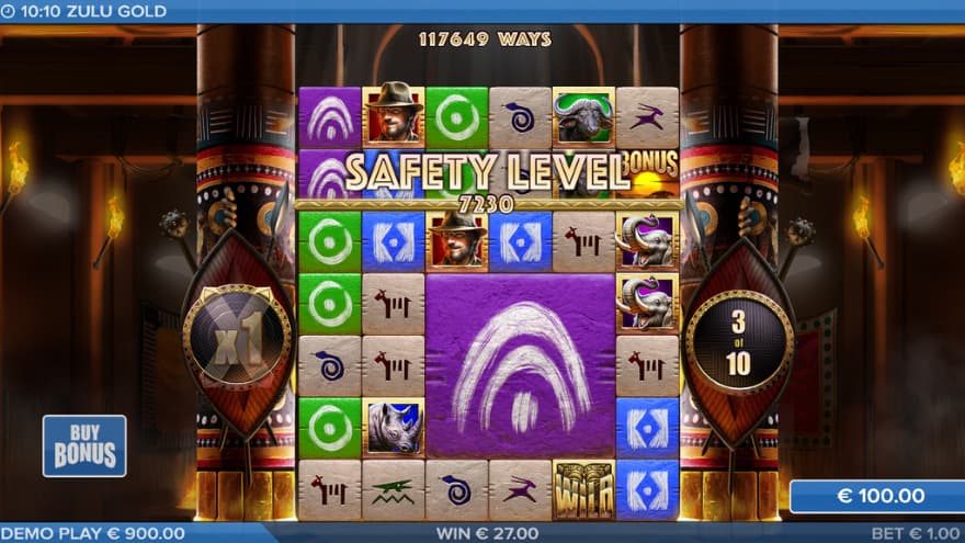 You always start with a safety level of 4 and when you create a winning combination through a free drop, this safety level will increase by 1. This results in you being guaranteed to land up to 8 symbols per reel during this feature, where there is a maximum of 262144 ways to win.