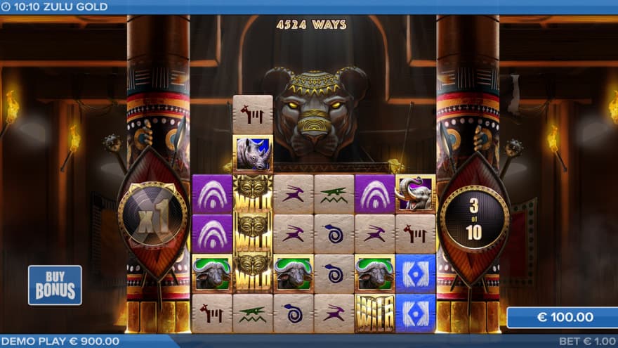 They can land in three different variants, such as normal wild, wild walker and charged wild symbols. Where the wild walker will move randomly when the symbol drop is completed. This results in a trail of wilds as it moves and if it moves into a Zulu stack this stack will be broken, leaving a 1X1 wild. However, if it passes scatter, wild or charged wilds, they will not be affected by this. The charged wild lands as 1X1 and it has three lives, where 1 life is consumed when it is part of a winning combination.