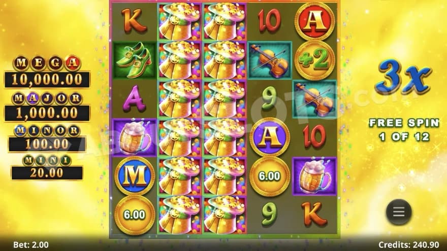 The lower-paying symbols include 9, 10, J, Q, K, and A. Five-of-a-kind with one of these will pay 1x the bet. The higher-paying symbols are more on theme, including a violin, harp, shoes, beer, and four-leaf clover. A full line of 5 with one of these pays 2x-5x the bet. The Wild symbol is a pot of gold. It substitutes for all other paying symbols, and a full wild line pays 10x the bet. Three lucky coins are used to trigger the free spins, colored purple, red, and green. Now, let’s take a look at the features!