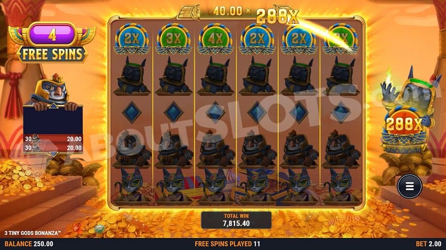 Watch out when hanging with these small gods. The features in 3 Tiny Gods Bonanza are Rolling Reels, Horus Blessing, Anubis Multiplier, Gift of Bastet, Free Spins, Feature Buy, and Gamble Feature.