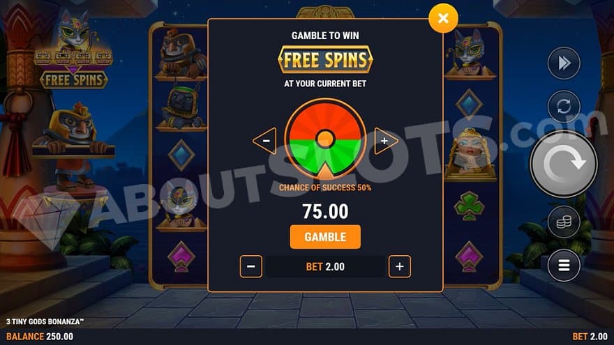 Instead of a certain ticket to the Free Spins like in the Feature Buy, you can try to gamble your way to it. Increasing and decreasing your chances of winning will also change the cost of the bet.