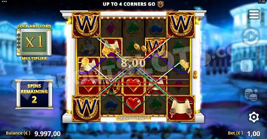 4 Corners of Rome from Northern Lights Gaming has a Lock and Load feature, keeping winning symbols in diagonal lines on the grid while the other symbols respins.