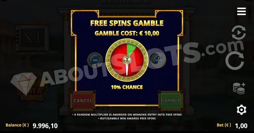 The lower-paying symbols in ancient Rome are the card deck suits spades, diamonds, clubs, and hearts. They pay between 0.1X-0.3X the bet for landing 3, and 0.3X-0.8X for a combination of 5. When moving up to the more valuable symbols, we find a scroll of papyrus, a jar with purple grapes next to it, and a Roman warrior helmet called Galea. They pay 0.3X-0.8 the bet for landing 3, and 1X-2.5X the bet for a full combination of 5. The wild symbol substitutes all mentioned symbols. It also pays on its own, the same amount as the Galea with 2.5X the bet for a combination of 5. The wild symbol doesn’t substitute the scatter symbol, which you need to activate the free spins and boost the Lock and Load multiplier. There’s also a multiplier symbol that can land in the free spins.
