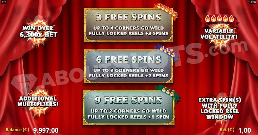 If you manage to fill all 25 positions with winning symbols, you’ll be rewarded with 3 extra spins in the highly volatile mode, 2 extra spins in the volatile mode, and 1 extra spin in the least volatile mode that starts out with 9 spins.