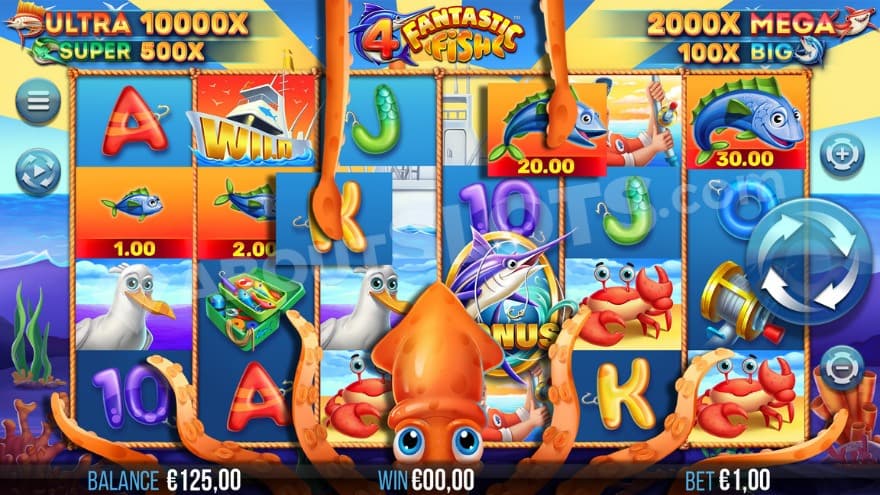 During the spins, the Giant Squid Bonus can be randomly activated. This squid will then shuffle the symbols, where within the base game it can improve a fish symbol win and within the bonus game, it can move fish symbols from locked reels to unlocked reels.