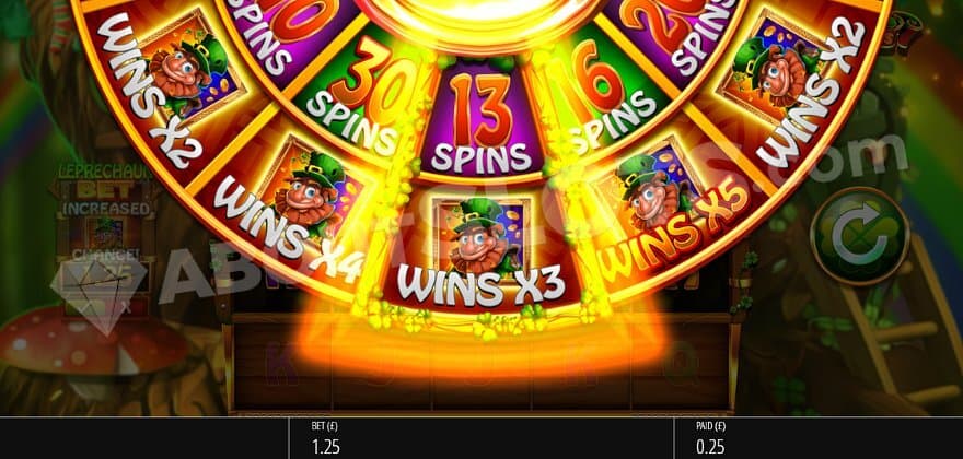 Land the Free Spins Symbol above a reel containing the leprechaun, and the Free Spins are all yours. The feature starts with a lottery wheel awarding the player between 10 and 30 spins and a multiplier of 2X-5X. The multiplier multiplies all wins by its value on all spins. A few more leprechauns are added to the reels to spice up the feature a little extra. The feature ends when the player is out of spins.