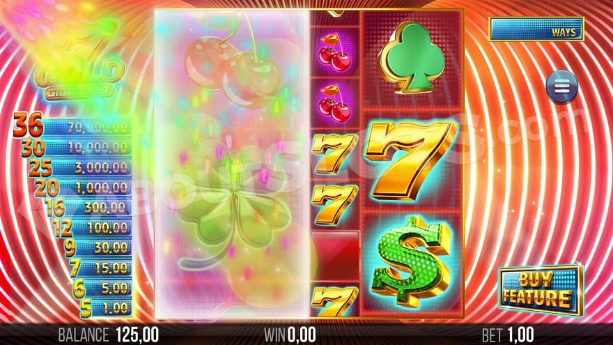 Within this golden universe await some sweet features. Make sure to check out Wild Symbol, Scatter Symbol, Gigablox, Glass Symbol, Gold 7 Bonus Symbol, Gold 7 Ladder Feature, Lights Reveal, Lights Shuffle, Giga Summon, Free Spins, and Bonus Buy.