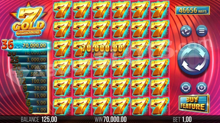 7 Gold Gigablox from 4ThePlayer has several high-paying features with huge Gigablox symbols, free spins with 46656 ways to win, and the Gold 7 Ladder awarding prizes up to 70000X the bet.