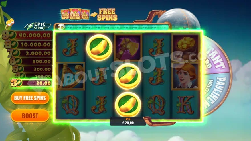 Within this bonus game, you also have the chance to land Enchanted Bean Symbols. When Enchanted Bean symbols land in Free Spins, they are collected, and 3 to 9 symbols will award a cash prize at the end of Free Spins. The winnings are added to payline wins. All collected beans are displayed on the left side of the reels.