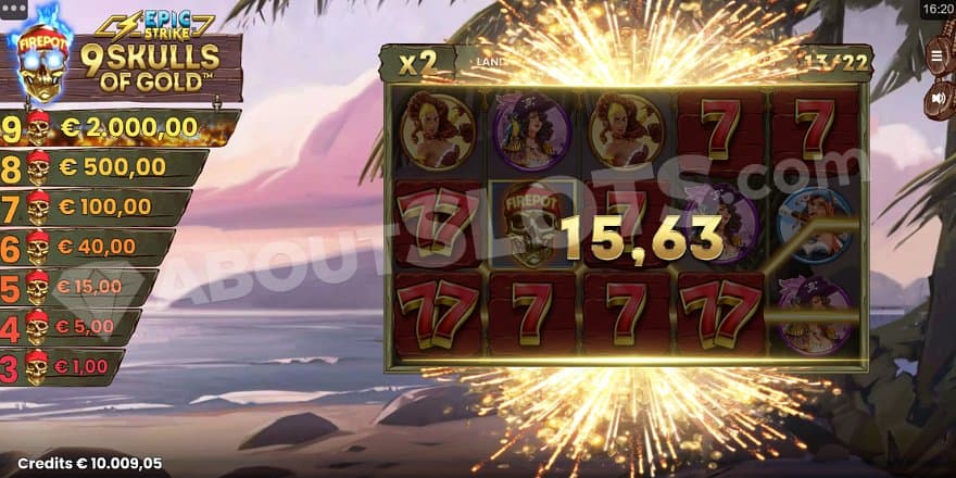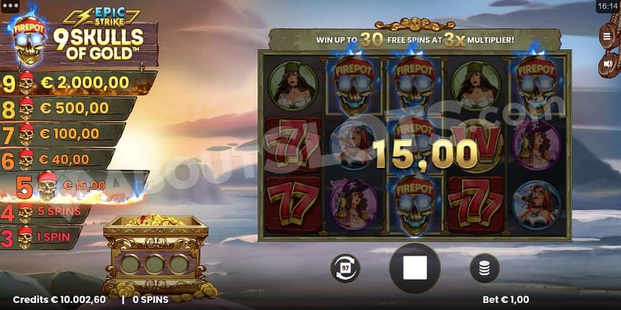 9 Skulls of Gold takes place in a beautiful setting. We’re standing on a beach, looking out to sea where the sun is about to set. Small waves are rolling in, and we can see a few peaky rock formations sticking up like small islands. It’s almost like we’re on the Phi Phi Islands in Thailand, the location where The Beach with Leonardo DiCaprio was shot. The reels are placed to the right, and to the left is a display of the wins in the Firepot feature, where you can win up to 2000X the bet in one spin. The music has a cover band touch, sounding like a sing-along tune, although there are no lyrics. To make a win, you need to land at least 3 of the same symbols on a payline going left to right, starting on the first reel to the left. 9 Skulls of Gold is available on all devices, such as desktops, notepads, and mobile phones.