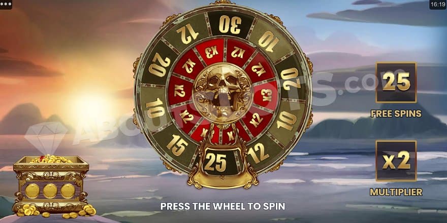 On this pirate adventure, make sure to look for the features Wild Symbol, Scatter Symbol, Golden Scatter Symbol, Firepot Symbol, Bonus Wheel, and Free Spins.