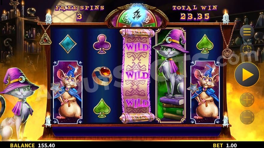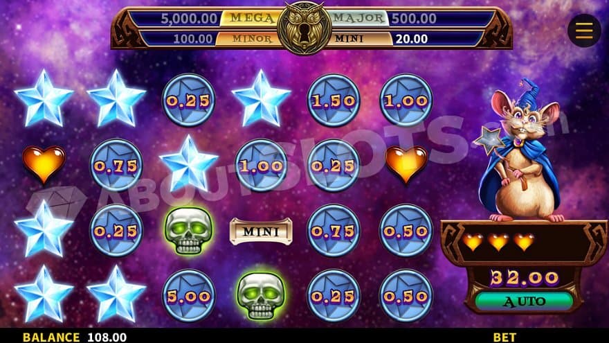 The lower-paying symbols are very familiar to every slot player. The card deck suits of clubs, spades, hearts, and diamonds pay 0.15X the bet for landing 3, and 5X the bet for landing 5. The higher-paying symbols are a ring, a crystal ball, a rat wearing a blue coat and a magic wand, and the cat wearing a purple magicians hat. Those symbols pay between 0.30X and 0.75X for landing 3 and 10X to 25X for a combination of 5. The rat comes either as a regular symbol or stacked two positions high. The cat can appear as a regular symbol or 2 or 3 positions high. The Wild Symbol is stacked three positions high and lands on the third reel. It substitutes all paying symbols. There’s also a star symbol that lands between the other symbols and doesn’t count in making paylines. The star symbol is collected in the bowl to the left of the reels and can randomly trigger the Pick Bonus.