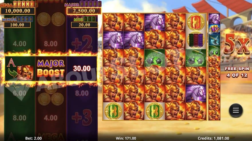 Action Boost: Gladiator is a new casino slot from SpinPlay Games, following up the developer’s previous games, Action Boost Gorilla Gems and Action Boost Amber Island. Players of those games will recognize the 3 different Free Spin features in green, red, and purple. The Green Free Spins expand the reels, giving you two more reels and double as many paylines, while the Red Free Spins can award the Mega Jackpot of 5,000X the bet. All this action goes down in a gladiator arena in ancient Rome.