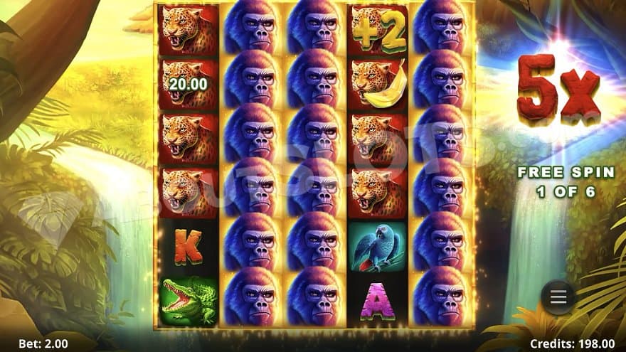 The Wild Symbol is a gorilla with a severe look on its face. It can appear anywhere and substitutes all regular paying symbols. It also pays on its own, awarding up to 10X the bet for a win.