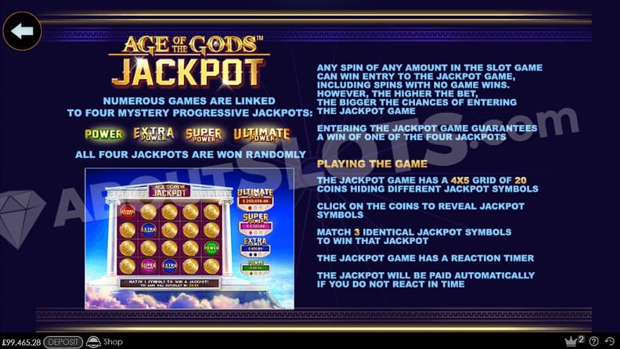 To be eligible to win one of the jackpots, players must play a slot game featuring the Age of the Gods Jackpot. The jackpot game is triggered randomly on any spin, and entering the game guarantees a win. The game is played by matching three jackpot symbols of the corresponding Jackpot.