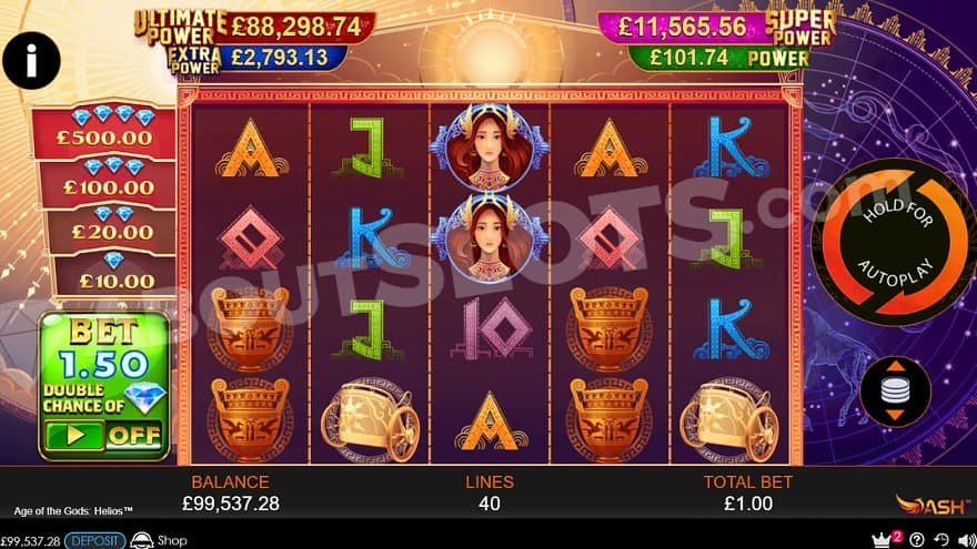 Age of the Gods: Helios is a video slot from Playtech with 5 reels, 4 rows, and 40 paylines. The Min.bet is 0.1 while the hefty Max.bet is 400. The default RTP is 94.98-95.01%, including a 0.99% contribution to the progressive Jackpot. You play this godly slot with mid-high volatility, and the max win is 2,500X the bet plus the progressive Jackpot.