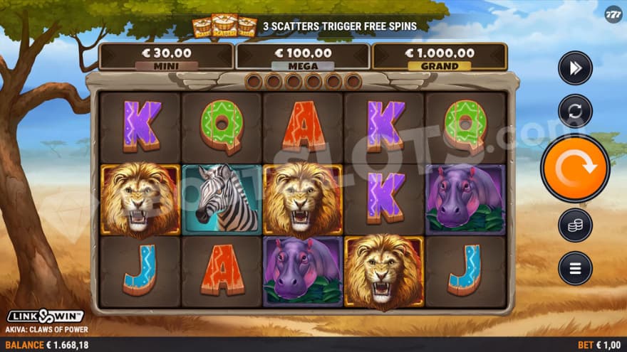 The lower-paying symbols are made up of the classic royal symbols J, Q, K, and A. Five-of-a-kind with one of these will pay 2x-3x the bet. A menagerie of wild animals acts as the higher-paying symbols. A full line with one of these will pay 7.5x-20x the bet. An animal track within a coin is the key to the Link&Win feature. 6 or more are needed to trigger it. A generic W is this game’s Wild symbol, substituting for all other paying symbols. The Scatter is depicted by bongo drums, which you need 3 of to trigger the Free Spins. Now, let’s take a look at the features!