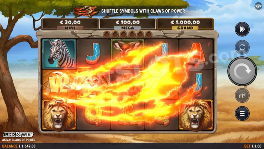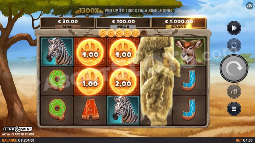 The menagerie of animals is complemented by a menagerie of features. The Akiva Sandstorm and Claws of Power keep you entertained during the base game. They are not necessarily super-exciting, but they seem to happen quite frequently, so it’s still a great addition to the game. Furthermore, we assume that the Akiva Sandstorm can also reveal coins, which makes it even more of a carrot.