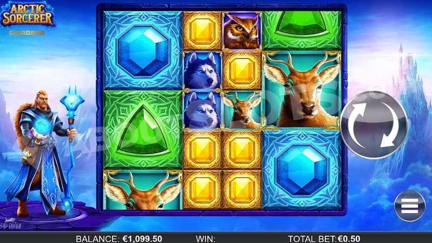 This feature can trigger anytime during the base game and free spins. The sorcerer shoots one or several mystery Gigablox symbols on the grid. After it has landed, the sorcerer uses his magic to transform the Gigablox into any of these 7 symbols: polar bear, wolf, gold gem, blue gem, purple gem, scatter symbol, or wild symbol. The Arctic Blast occurs before wins and feature triggers are evaluated.
