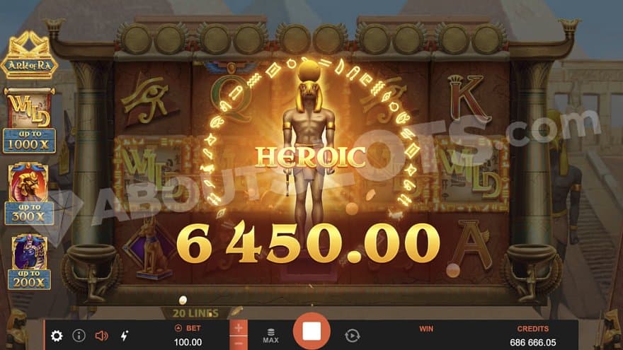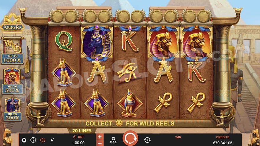 Might of Ra, Blaze of Ra, and Book of Ra Deluxe are just three examples of games with the falcon-headed god, with the last of these games being a classic from 2008. Book of Ra Deluxe’s max win is stated per spin, and we’d like to think that the max win of 1000X the bet in Ark of Ra also is per spin. Landing wild symbols on all 20 paylines equals a win of 1000X the bet, which should considerably raise the max win in the free spins. The max win in one spin containing only Ra or Anubis is 300X and 200X the bet.