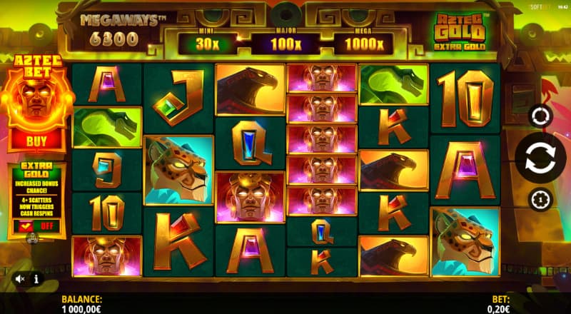 With a slot that mentions gold twice in its name, you understand that it will be a fast-paced gaming experience with big wins. Here you can take part in features such as Cascading wins, Aztec Gold Cash Respins, Aztec bet and even modifiers. These are Max Megaways and Sun disc boost.