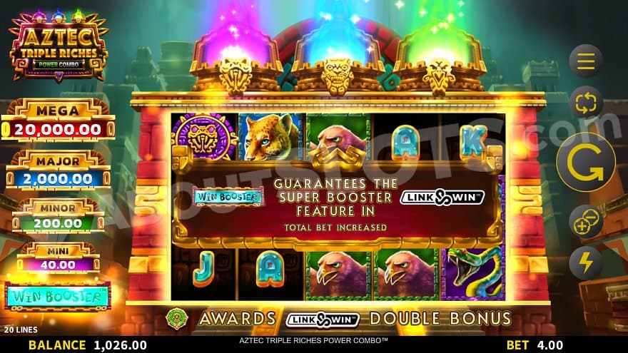 This feature is available in the base game only. It awards a guaranteed Super Booster feature in all Link&Win bonuses. Activating the Win Booster increases the total bet by 2X. The feature does not affect line pays or Link&Win symbol pays.